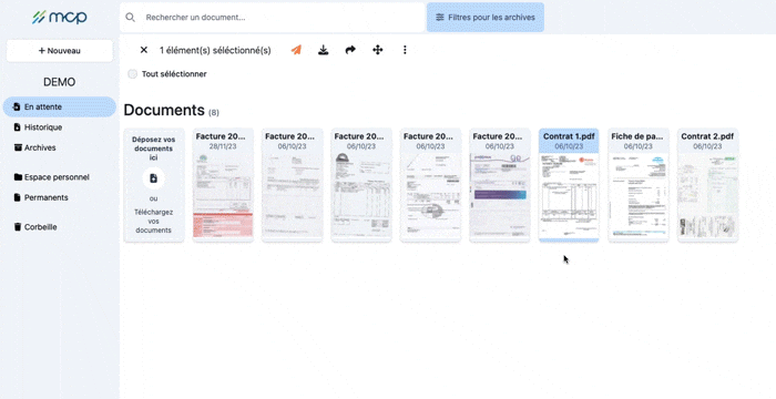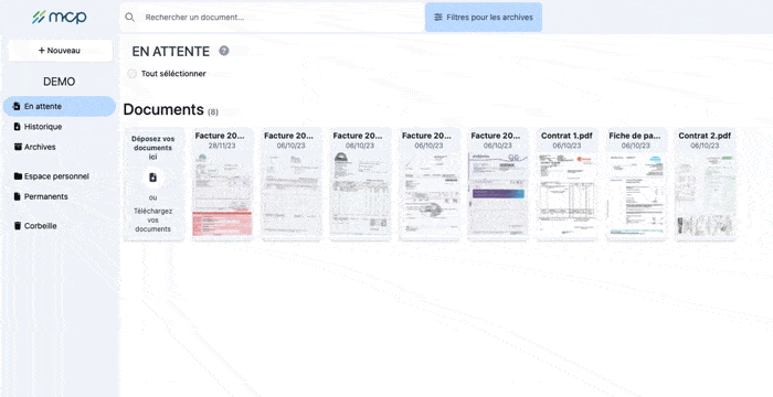 - Via les boutons “Nouveau”, ou télécharger, vous ajoutez votre document, ou simplement en glisser-déposer directement dans la plateforme. Vous pouvez également déposer vos tickets du quotidien via notre application Note de frais.